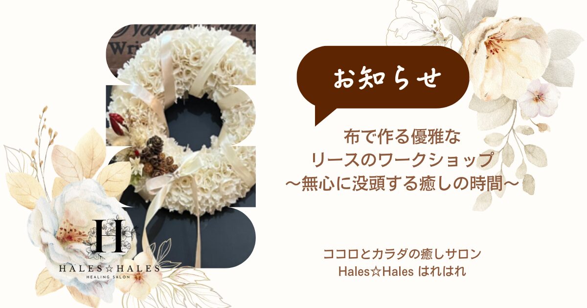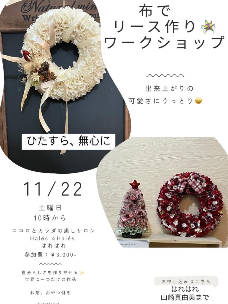 秋が深まり、そろそろお部屋のインテリアを季節に合わせたものに変えたいとお考えではありませんか?ココロとカラダの癒しサロン「Halés ☆Halés(はれはれ)」では、11月22日(土)に布を使ったリース作りのワークショップを開催します。
